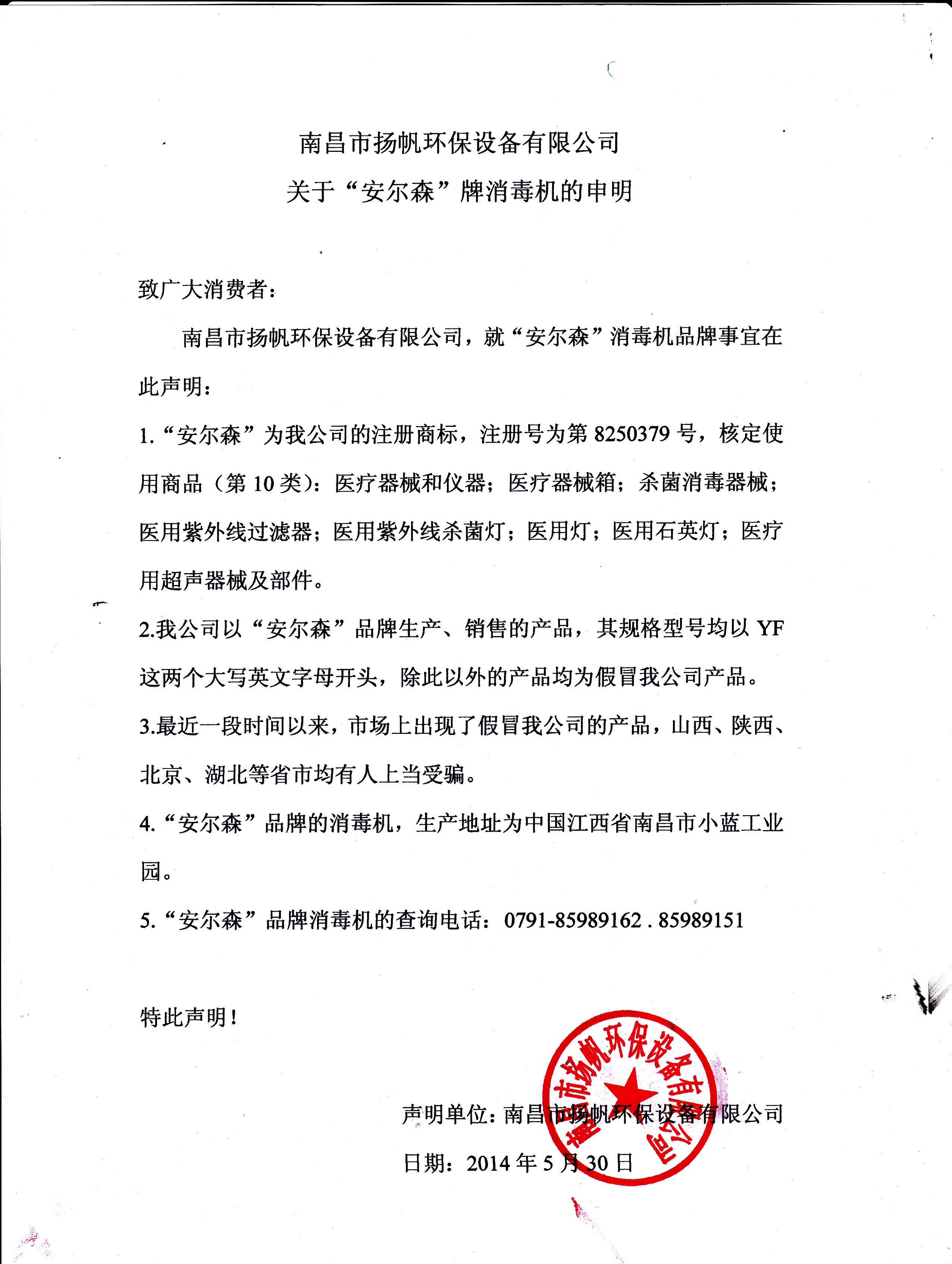 南昌市揚帆環(huán)保設備有限公司,就“安爾森”消毒機品牌事宜在此聲明: